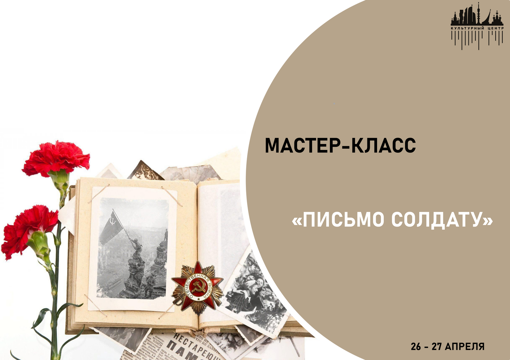 26-27 апреля в ДК "Культурный центр" пройдет мастер-класс “Письмо солдату”, где каждый желающий сможет написать письмо ветеранам Великой Отечественной войны и участникам специальной военной операции (СВО).